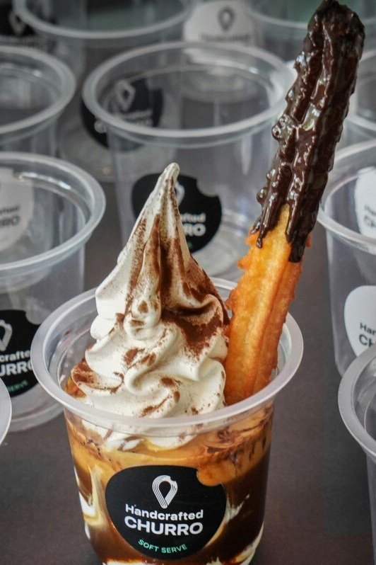 2025er-Version: Softeis auf pflanzlicher Linsenbasis mit einer Churro-Stange, die als Löffel dient. Churros sind ein aktueller süßer Snack-Trend, der auf immer mehr Food-Märkten angeboten wird.