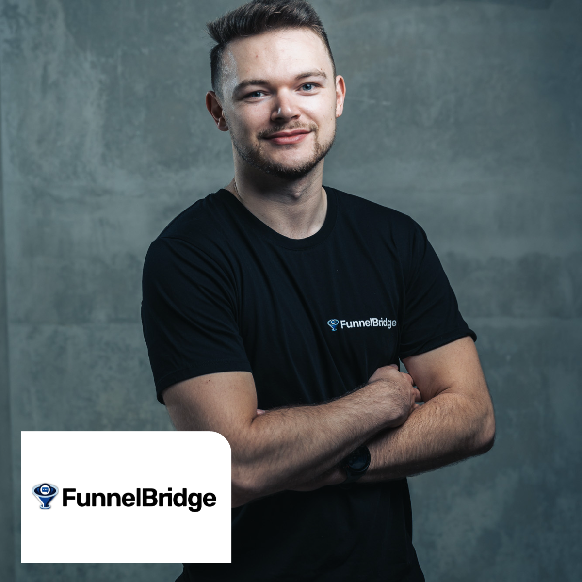 Junger Mann mit Brille, Bart, Tattoos, schwarzem T-Shirt und Smartwatch lehnt an einer Metalltheke vor einem modernen Gebäude mit viel Glas und Metallstruktur.