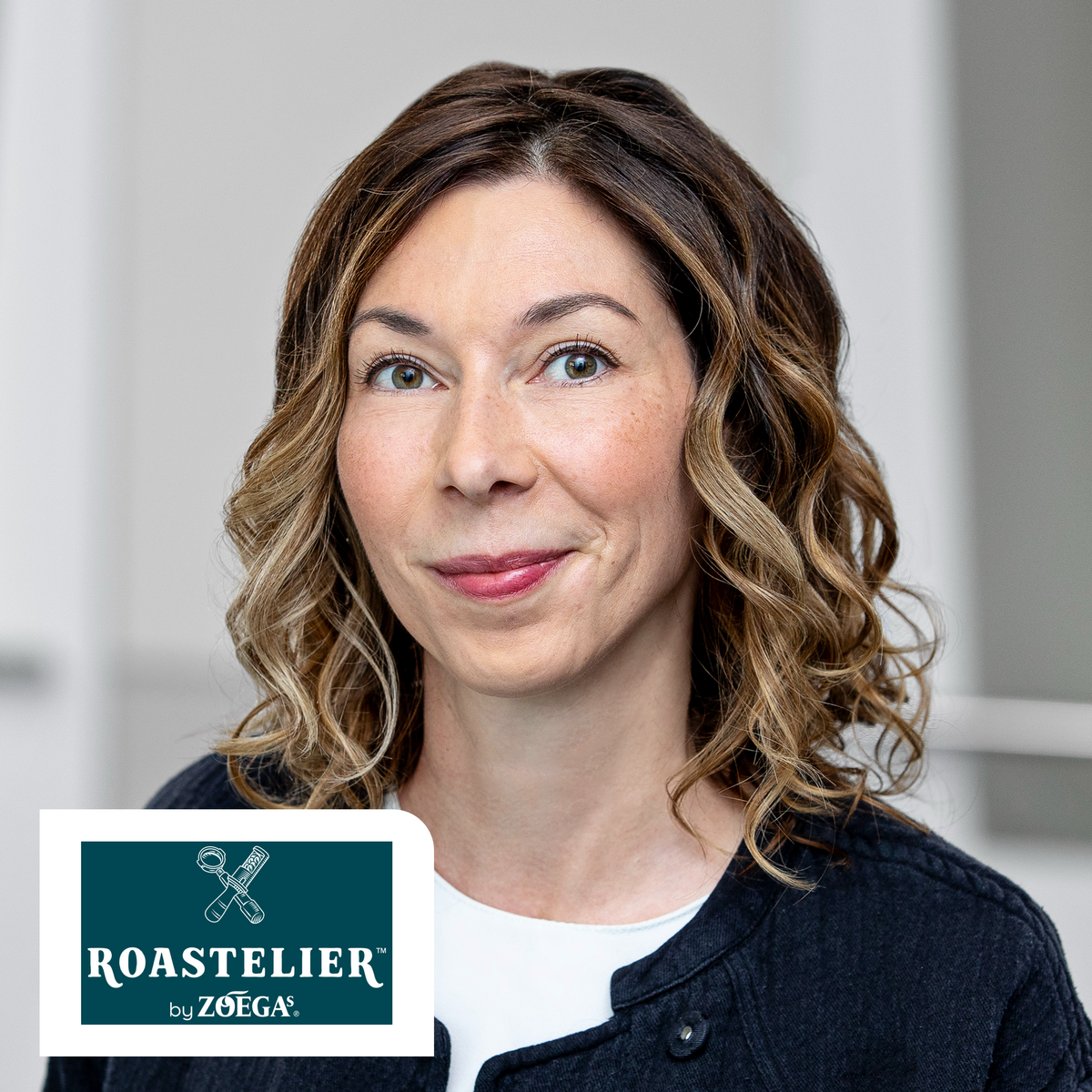 Logo von Roasterier by Zoegas mit einer Linie Zeichnung eines Kaffeekännchens, einer Tasse und einem Kaffeebohnenbehälter auf dunkelgrünem Hintergrund.