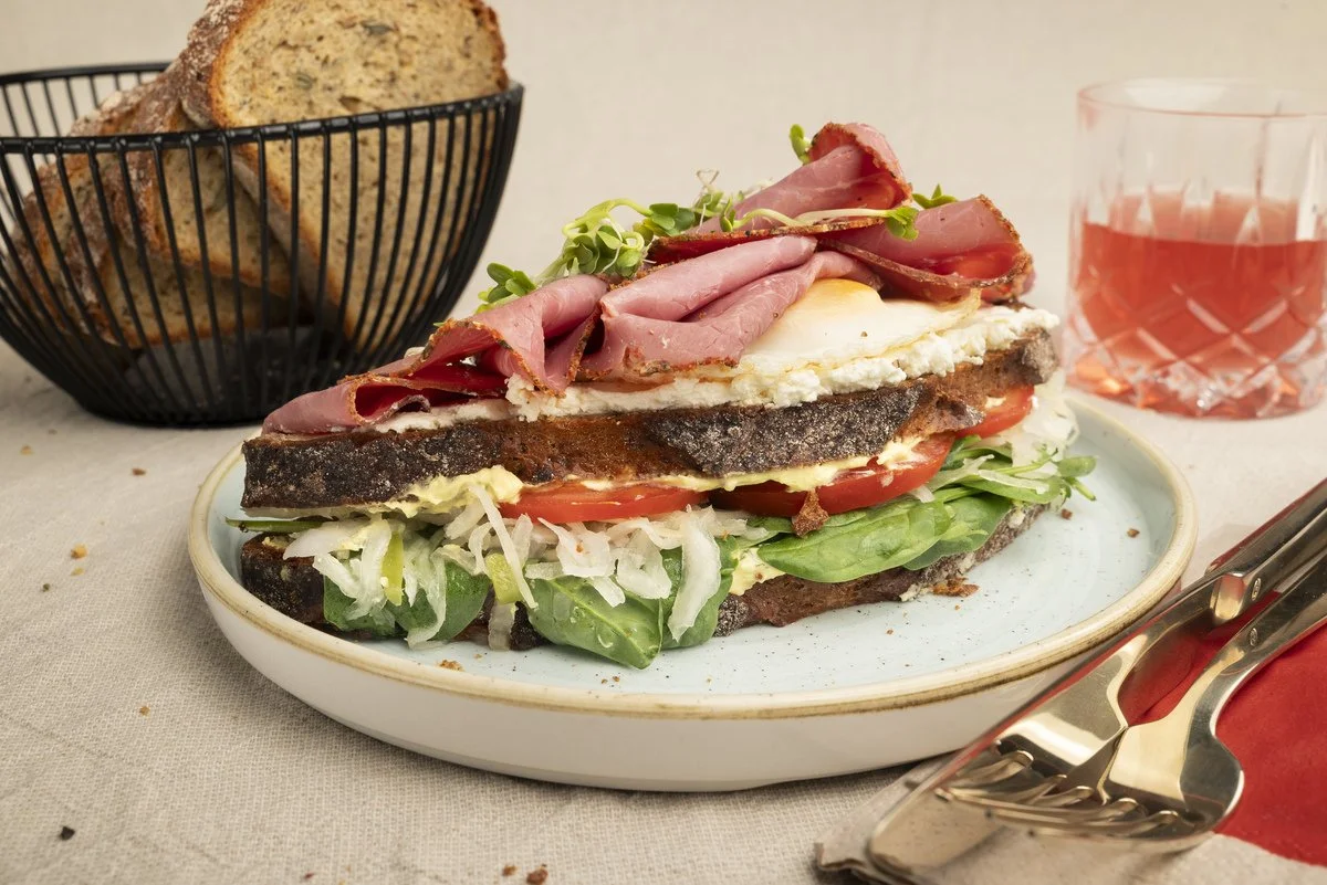 Ein belegtes Brot mit Schinken, Ei, Tomaten, Salat auf einem Teller, daneben eine Glas mit rosa Getränk, im Hintergrund eine Schüssel mit Toastbrot. Alttext für SEO.